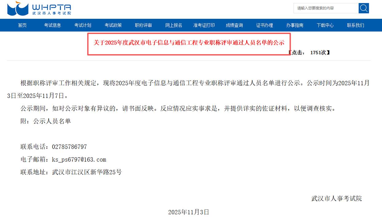 2025年11月3日,武漢市電子信息與通信工程中高級工程師職稱評審結(jié)果率先發(fā)布公示。
